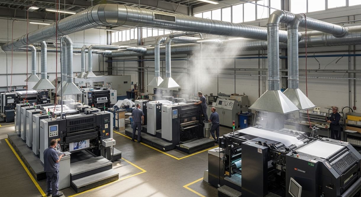 Современная типография — это сложный производственный комплекс, где на ограниченной площади одновременно работают люди и десятки единиц оборудования, выделяющего тепло, испарения и мелкодисперсную пыль. Без грамотно спроектированной системы воздухообмена производство попросту задохнется: концентрация летучих органических соединений от красок и смывок быстро достигнет опасных пределов, а мельчайшие частицы бумаги и пудры будут оседать на всем оборудовании, вызывая его преждевременный износ.